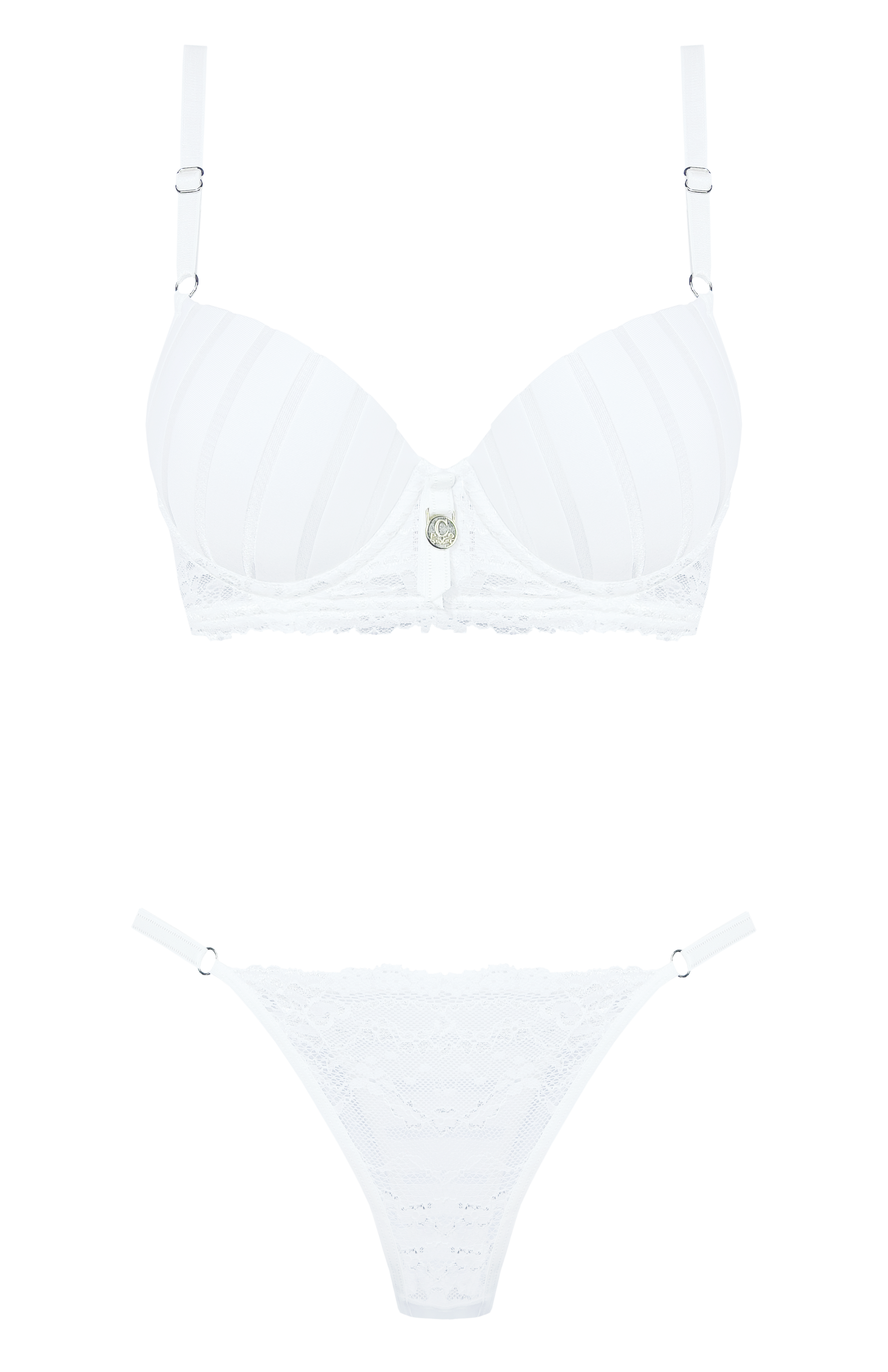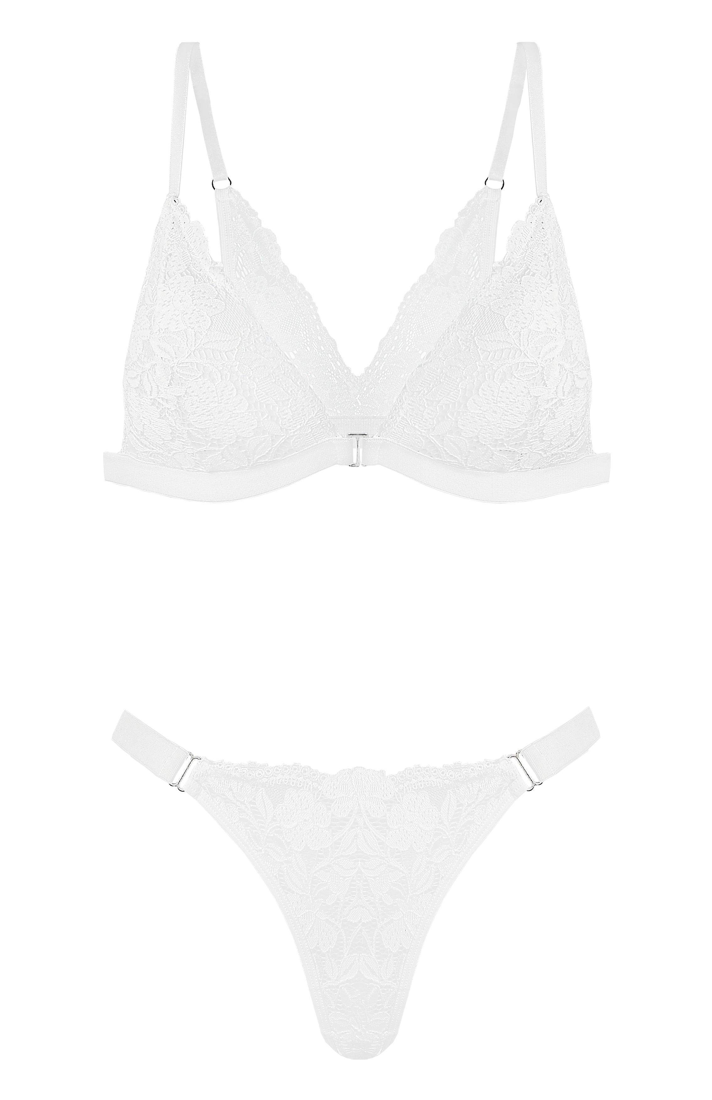 Conjunto taza soft triángulo de puntilla con broche delantero y tanga less.